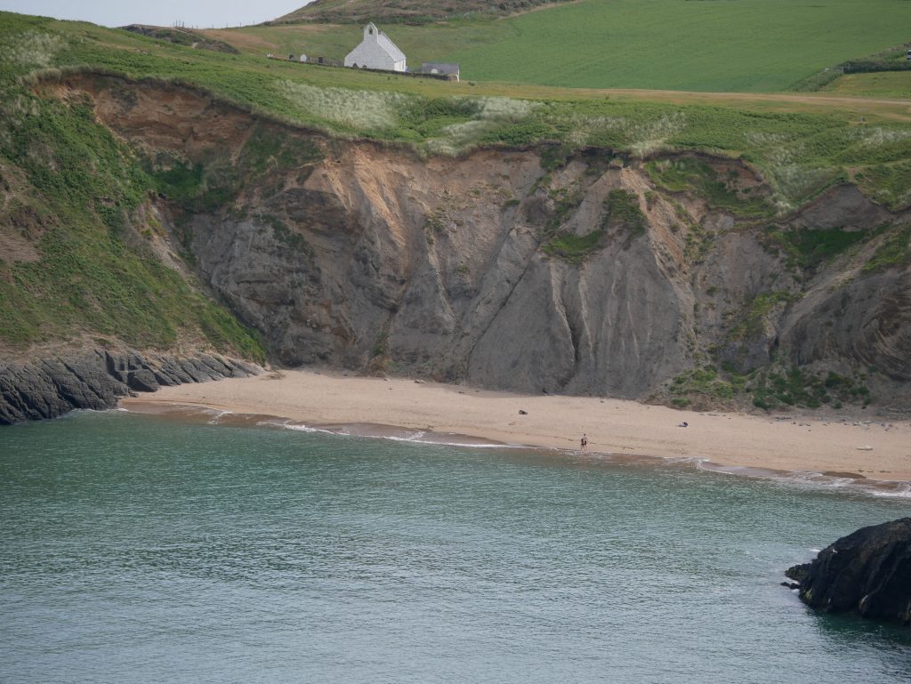 Not a particularly inspiring walk today ! Bed and wrong side comes to mind. Forever friend has been enjoying a seat overlooking Mwnt beach with the beautiful but small church in the backdrop. Dolphins feed here and after my walk’s end we saw them while drinking a coffee from the nearby cafe. That was reward enough. Wales from now on may be a little disjointed as further travels are required and the use of Air-B-N-B’s as I move further afield. A couple more pictures from today.