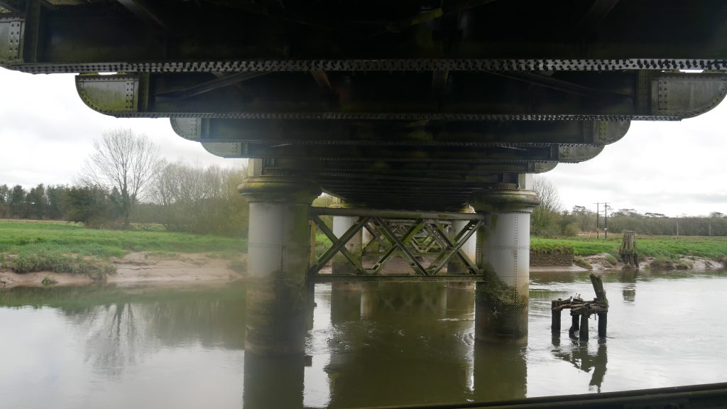 On the footbridge , leaving the station and looking upstream to the ‘old’ road crossing. We cross a footbridge take a ‘left’ beside the traffic and head down stream. At the moment we are close too the water.