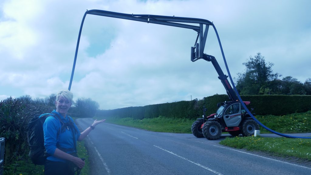 As we walk under this bridge its not long before its a distant memory as the path takes us gradually away from the riverside and across fields where we see a farmer pumping his slurry into a field across the road from the source at his farm. Ingeniously he has lifted the pipe with one of his tractors, forming a bridge for the traffic.