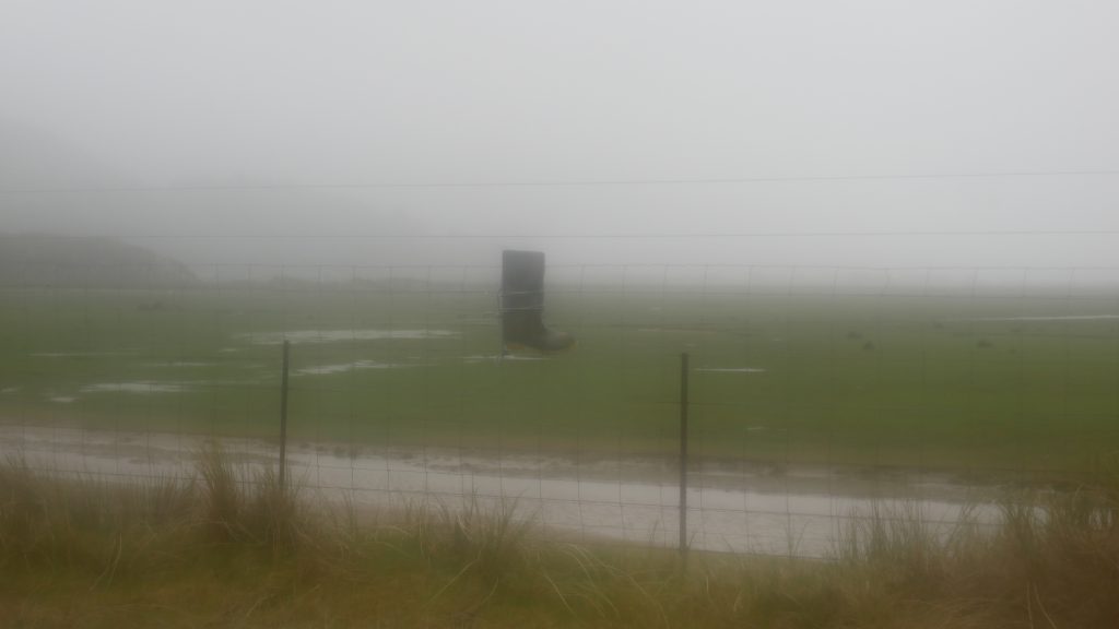 There are one or two runners and cyclists about doing their ‘early exercise’ and as we look out onto the misty estuary spot this wellington jammed into the fencing at the far side of the railway. Is somebody trying to tell us something ?