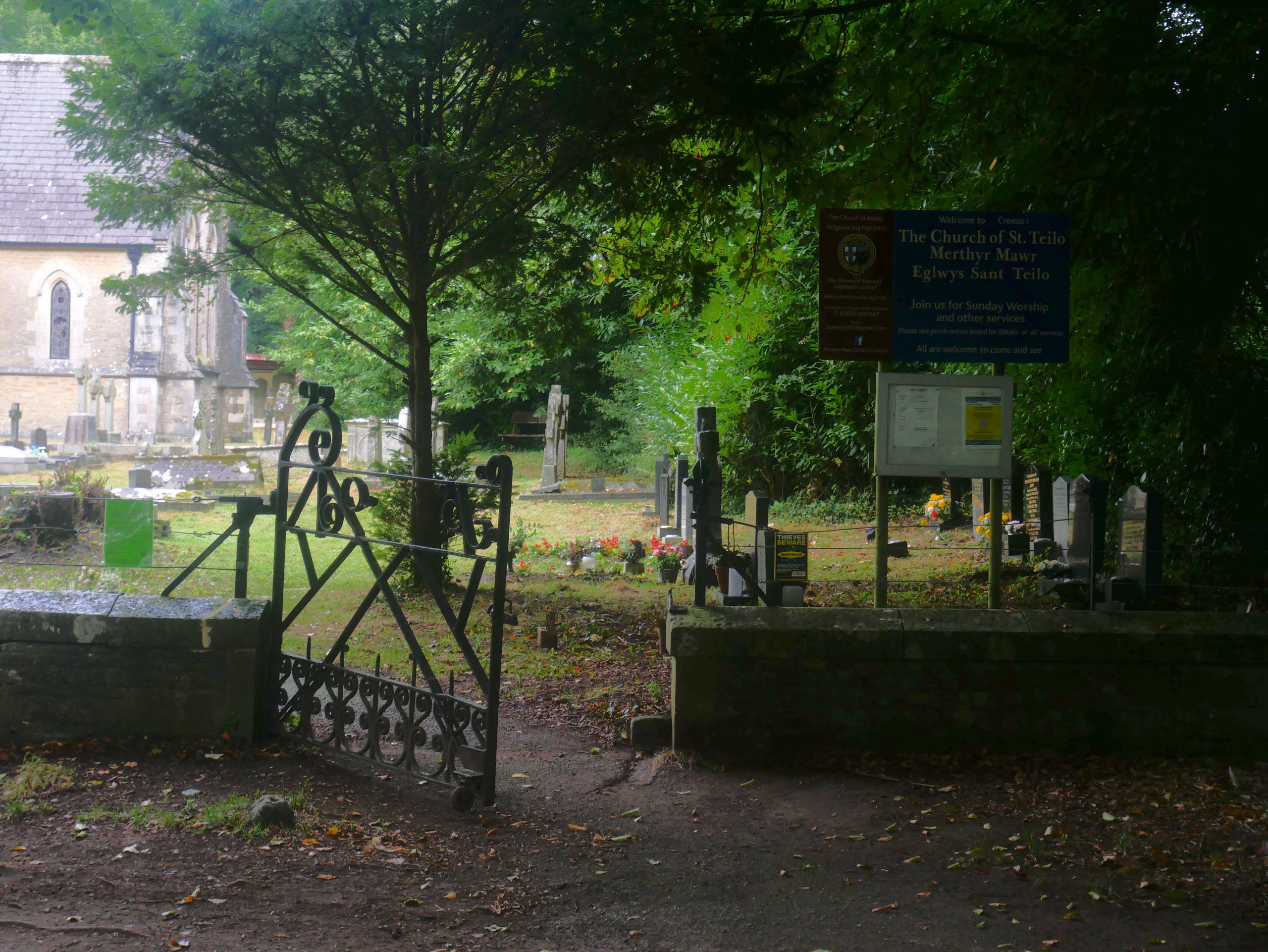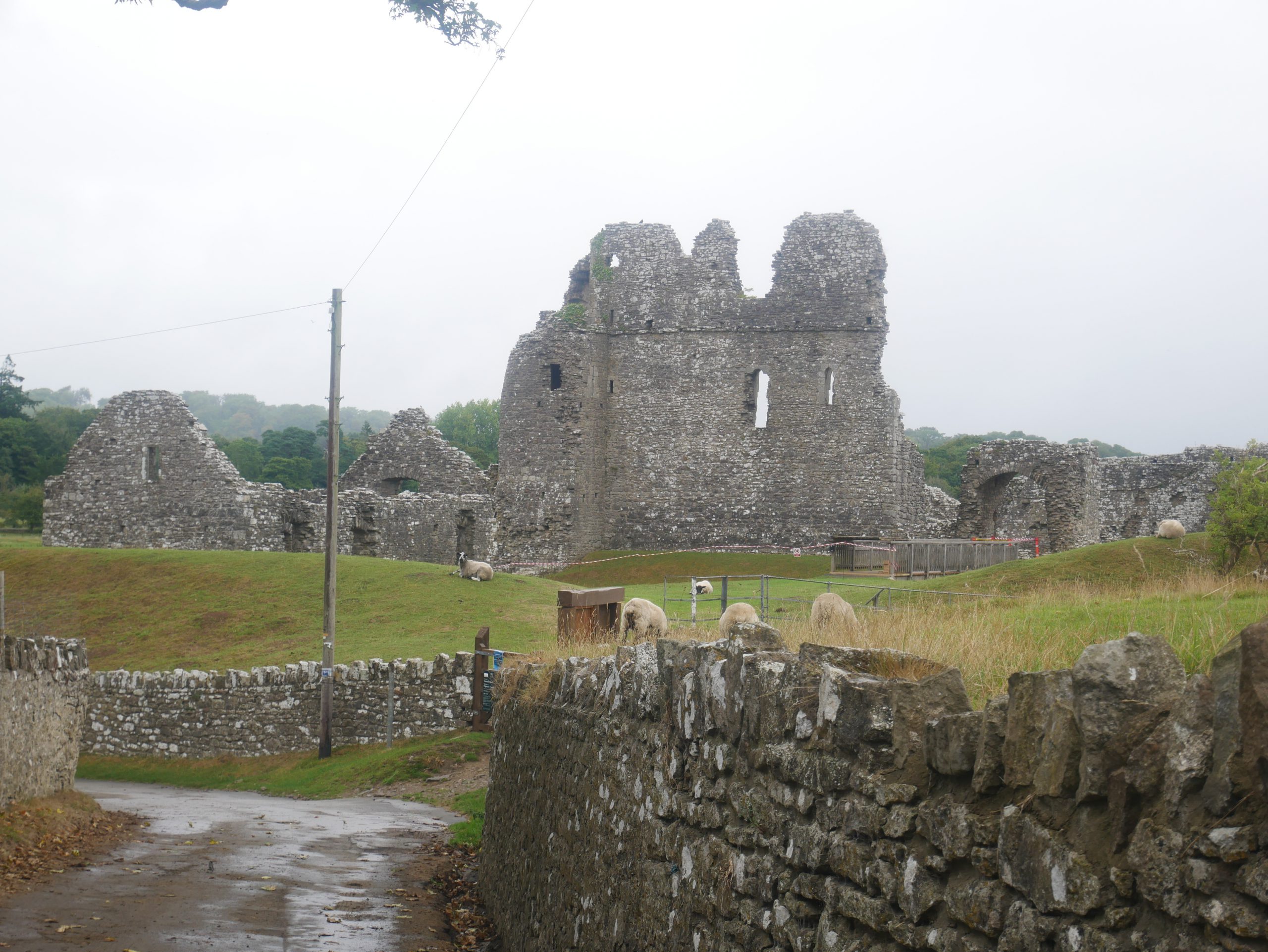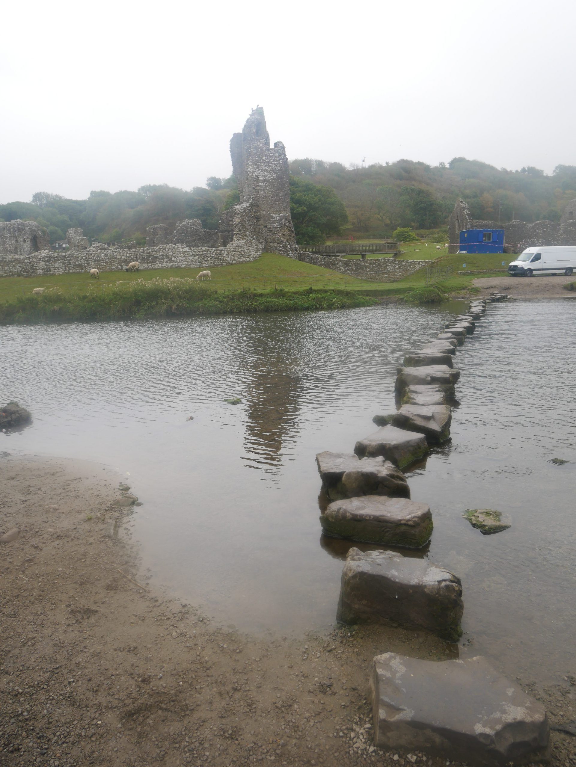 I walk down to the river and the castle is on my right. The flow is fast and being elderly I am a little nervous of the stones (not all are flat) with a heavy rucksack on my back. I cross with relief and its raining a little now. I sit on a damp wooden seat viewing the castle and eating lunch before I move on to Merthy Mawr.