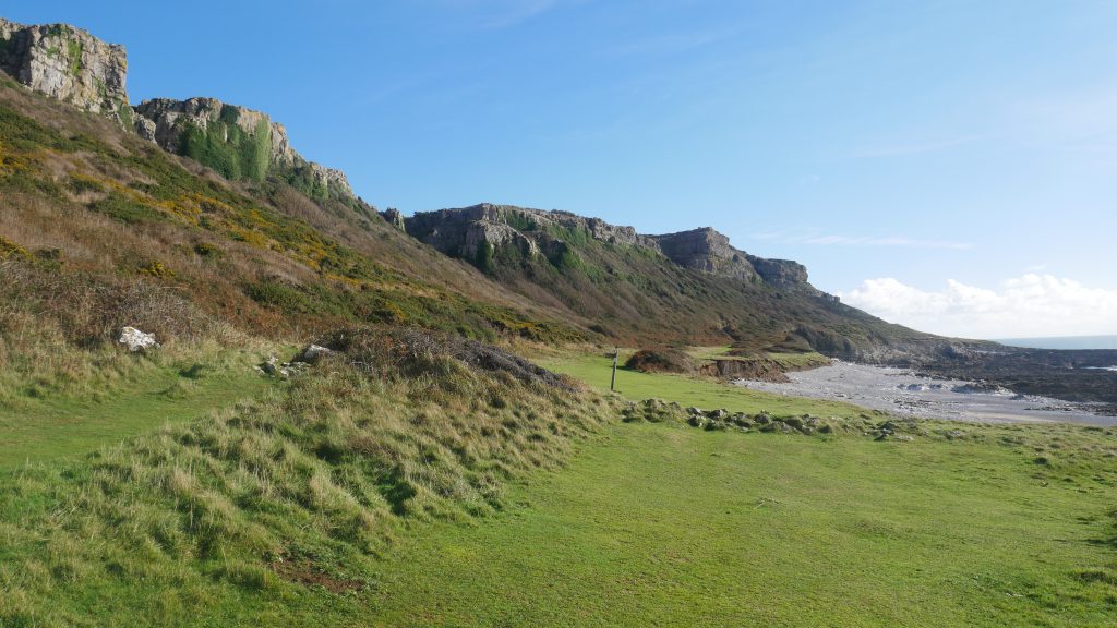 Having climbed the few yards pack onto the path I am walking through beautiful woodland and the path drops down again as I wonder if there will be another ‘4 stopper’ to climb. After my descent I am greeted with a lovely flat shoreline extending as far as I can see. Much relief. The gower peninsular is an ‘AONB’ Area Of Oustanding NationaL Beauty’ and although the shore line immediately before me is not spectacular the cliff face to my right is.
